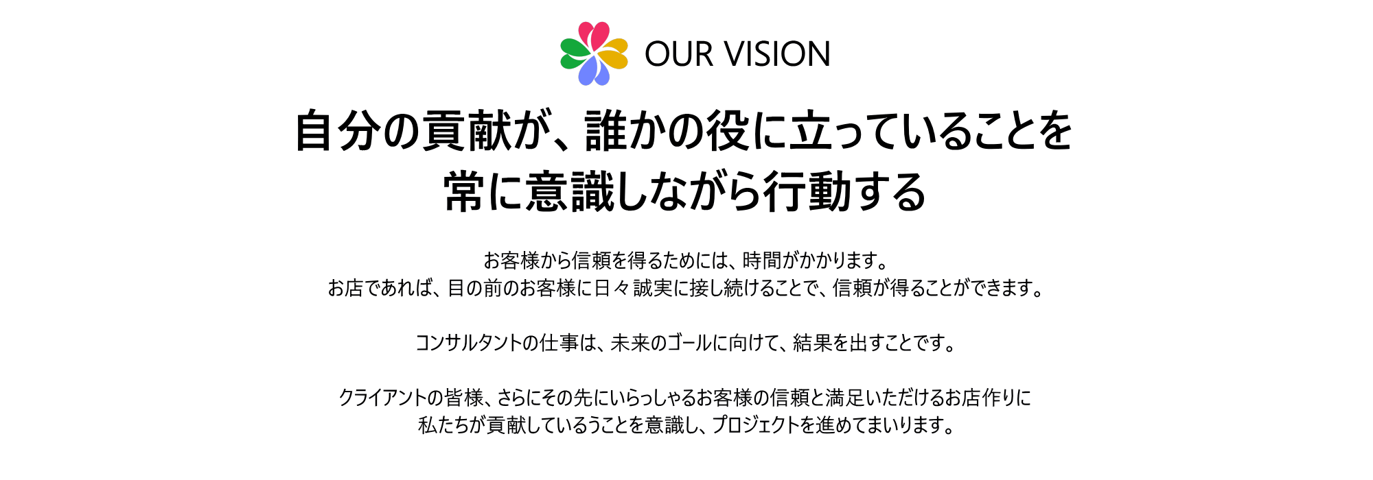 ホーム> コンサルティング> 当社について 指導方針 10年後も生き残る店舗経営を目指したコンサルティング 「気づきを築く」コンサルティング会社 昭和・平成時代のパワハラ思考で、この先も会社を続けていくつもりですか? 過去には、経営者や上司の権威が強調され、パワーハラスメントが許容されていた時代がありました。しかし、近年では労働環境の改善や働き方改革が進み、従業員のメンタルヘルスや生産性に悪影響を及ぼすだけでなく、法的な問題も引き起こす可能性があります。弊社では、会社側、従業員側などの偏りをなくし、双方の中立な立場から職場からパワハラを排除するサポートを行います。 店舗経営に正解はありません。しかし不正解はあります。 世の中には「成功理論」と呼ばれるものがあります。それをやれば誰でも会社が成功するというもの。では御社の現状はどうでしょうか? 他社で成功したことが、御社にとって「絶対的な成功理論=正解」などないのです。しかし、お客様や社員に対して「やってはいけないこと=不正解」は存在します。不正解を排除することで、経営は一気に改善します。 「店舗」「商品」「人材」のバランスが大切です お店経営には「店舗」「商品」「人材」が必要なことは、周知のとおりだと思います。ではこの3つをバランスよく保つことが出来ていますか? 当社では上記の項目をさらに3つに分け「9ブランンディング」という独自理論を元に、常にバランスの良い店舗経営をサポートいたします。 人材(個性)を活かした適材適所の重要性 大リーグで活躍する大谷翔平さん。「二刀流では成功しない」と指摘するコーチや野球評論家が多い中、それを貫いた結果。現在の活躍をみれば、批判的な意見もすべて払拭されました。社員やアルバイトそれぞれが「個性」を持っています。それ見抜き、活かすことが、経営者や管理職の仕事です。当社代表の加藤は、40年以上にわたり母親から教わった卓越した「人間観察力」を活かし、瞬時に社員の個性を見抜き、適材適所のアドバイスをいたします。人材育成とは「すでに持っている潜在能力を引き出すこと」なのです。 女性向け消費財とチェーン店指導に強い会社です 皆さんのお店では、女性のお客様に満足いただく仕掛けを提供していますか? 当社のコンサルティングでは、女性のお客様が【魅力的なお店】と思っていただけるアイデアの提供、店舗のレイアウト変更や商品構成、上質な接客サービスまでワンストップで指導を行います。 またチェーン店については、藤田商店(旧日本マクドナルド親会社)で身に着けた「チェーンオペレーション」を活かし、人・モノ・金(数値管理)の標準化を図り、失敗しないチェーン展開を成功へ導きます。 事前相談(メール対応) 初回相談のご案内